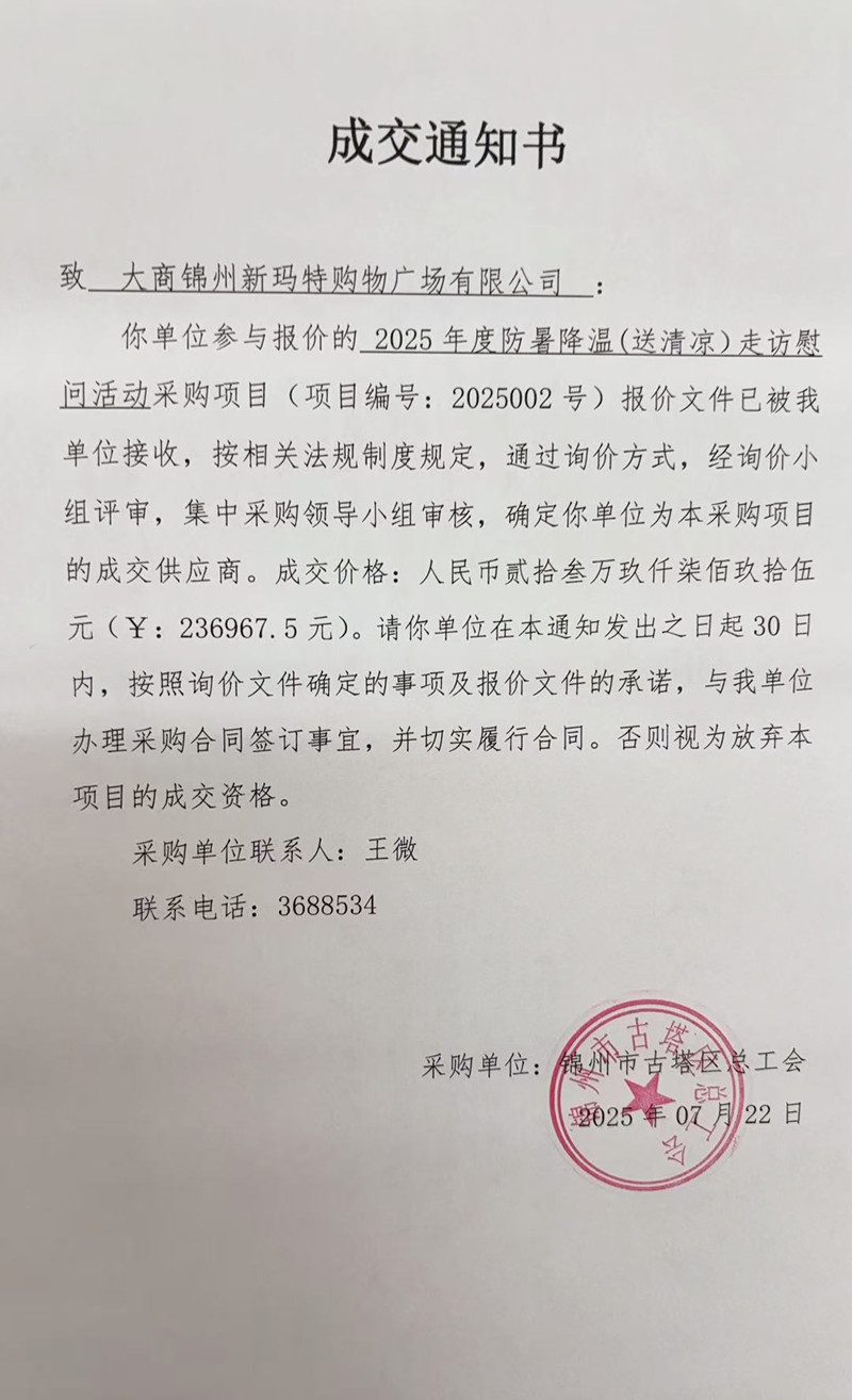 古塔区总工会关于对2025年度防暑降温走访慰问活动采购成交通知书的公示