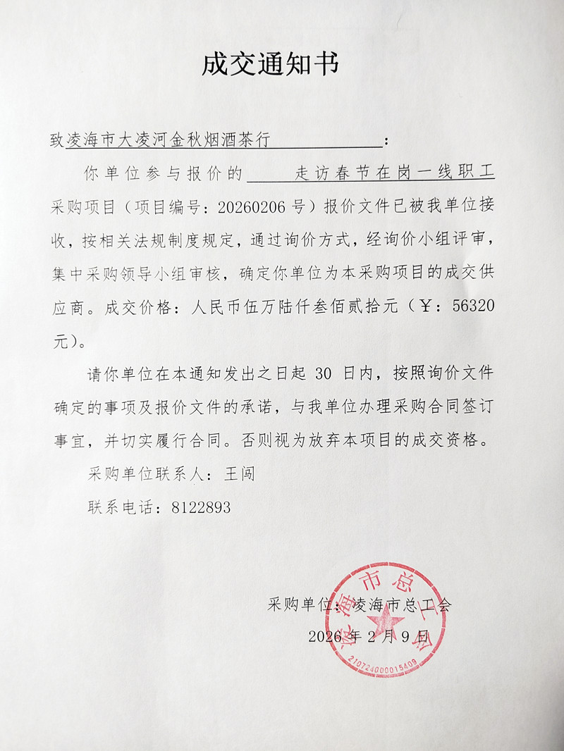 凌海市总工会关于走访春节在岗一线职工采购项目成交通知书
