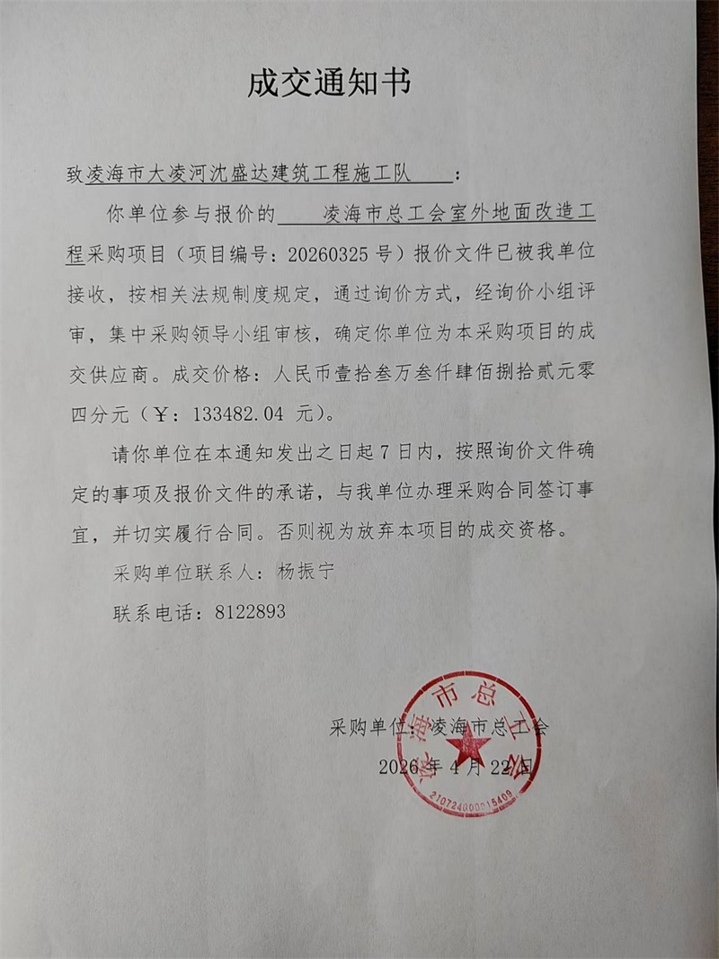 凌海市总工会室外地面改造工程采购项目成交通知书